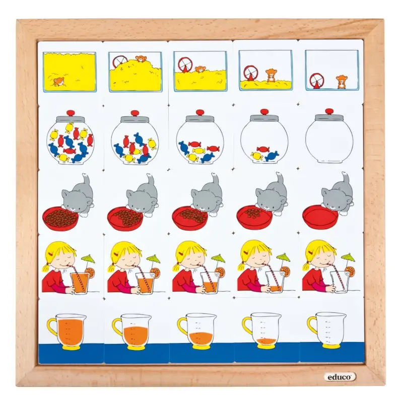 Diagramm Inhalt von Educo ist ein hochwertiges Lernspiel zum Thema Volumen. Es enthält einen Holzrahmen mit fünf Bildkartensätzen, die eine allmähliche Vergrößerung oder Verkleinerung des Volumens darstellen, mit denen im Diagramm Reihen gebildet werden müssen, die von leer nach voll und umgekehrt verlaufen.