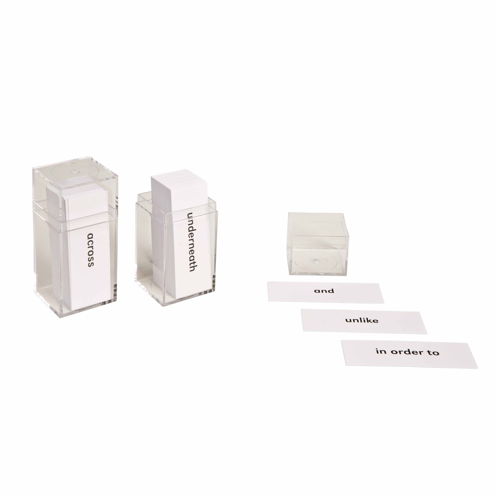 The Nienhuis Montessori conjunction and prepositions exercises set includes 120 prepositions used for introductory exercises to foundational grammar skills. The only conjunction provided is the word ‘and’.