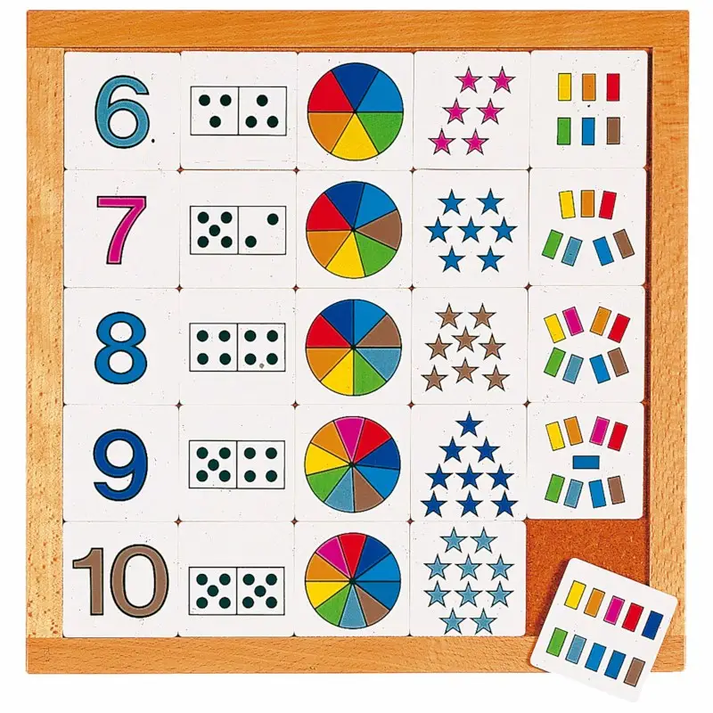 Educo counting diagram 6 to 10 is a wooden frame introducing number correspondence and counting. This educational toy contains a set of image cards with numbers 6 to 10 visualised in number symbols, dice, part of a circle, stars and squares.