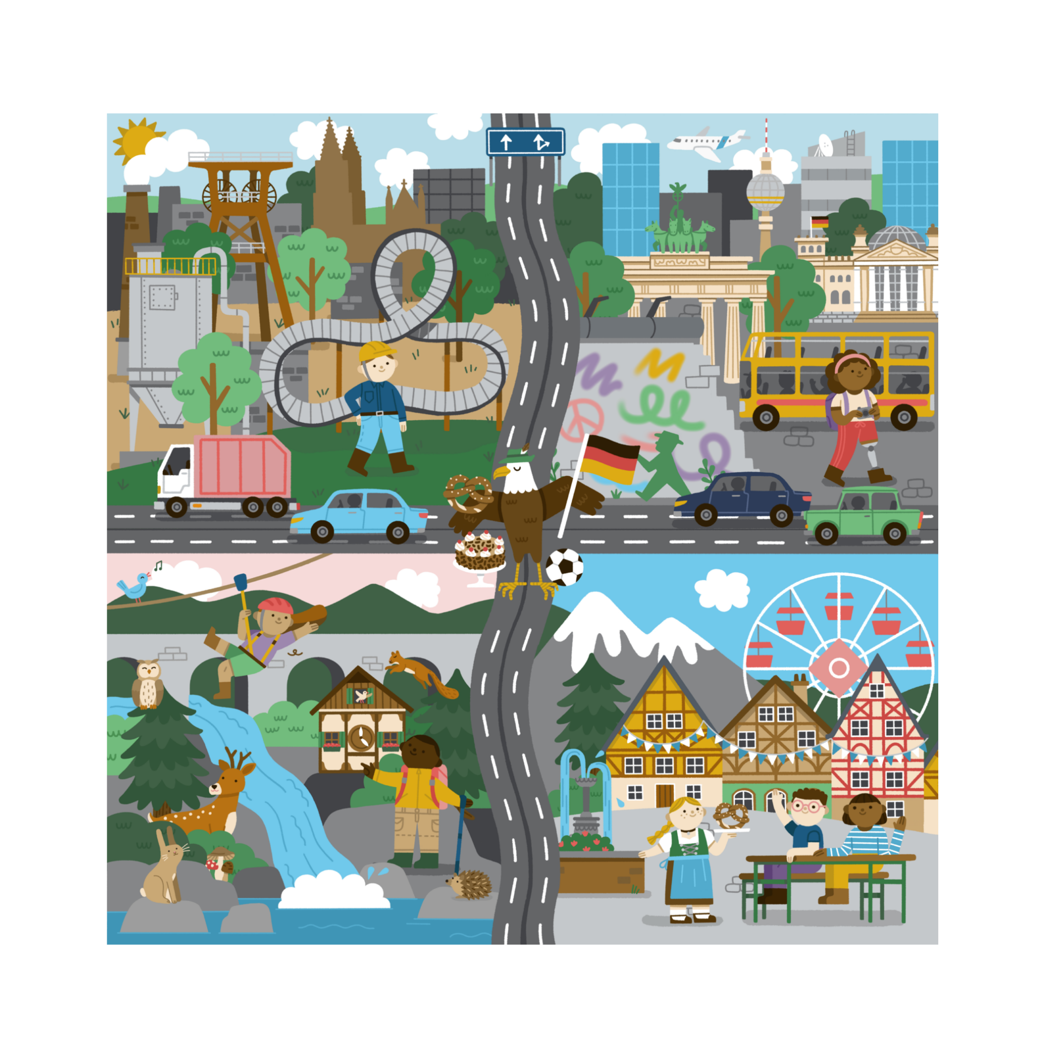 This beautiful and high quality wooden jigsaw puzzle depicts different elements typical to the country Germany. A drawing on the bottom plate of the puzzle frame is printed in reduced black and white to help children complete the puzzle.