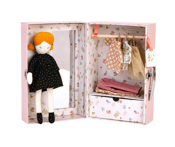 Mademoiselle Blanche invites you into her dressing room – this lovely little wardrobe suitcase and fabric doll has a built-in mirror, a wooden hanging rail, and illustrated hangers, containing three outfits stored in a drawer. Whether it’s a night out on the town or a sleepover, it’s up to you to choose her outfit!