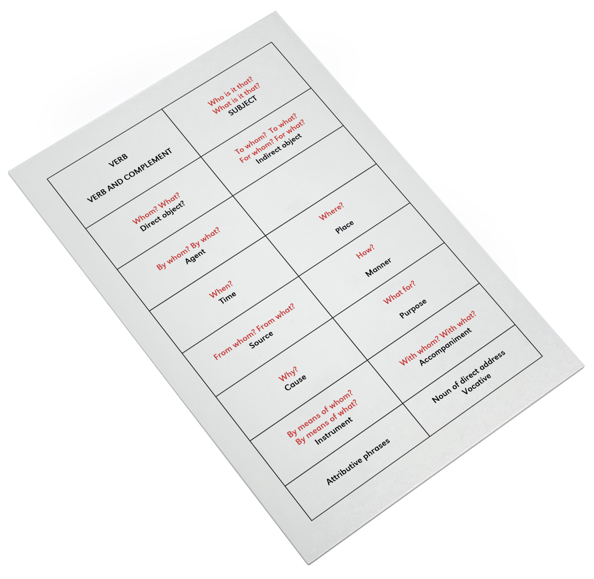 The Nienhuis Montessori sentence analysis working chart helps the child correct their own work and links the simple questions of the nomenclature of grammar.