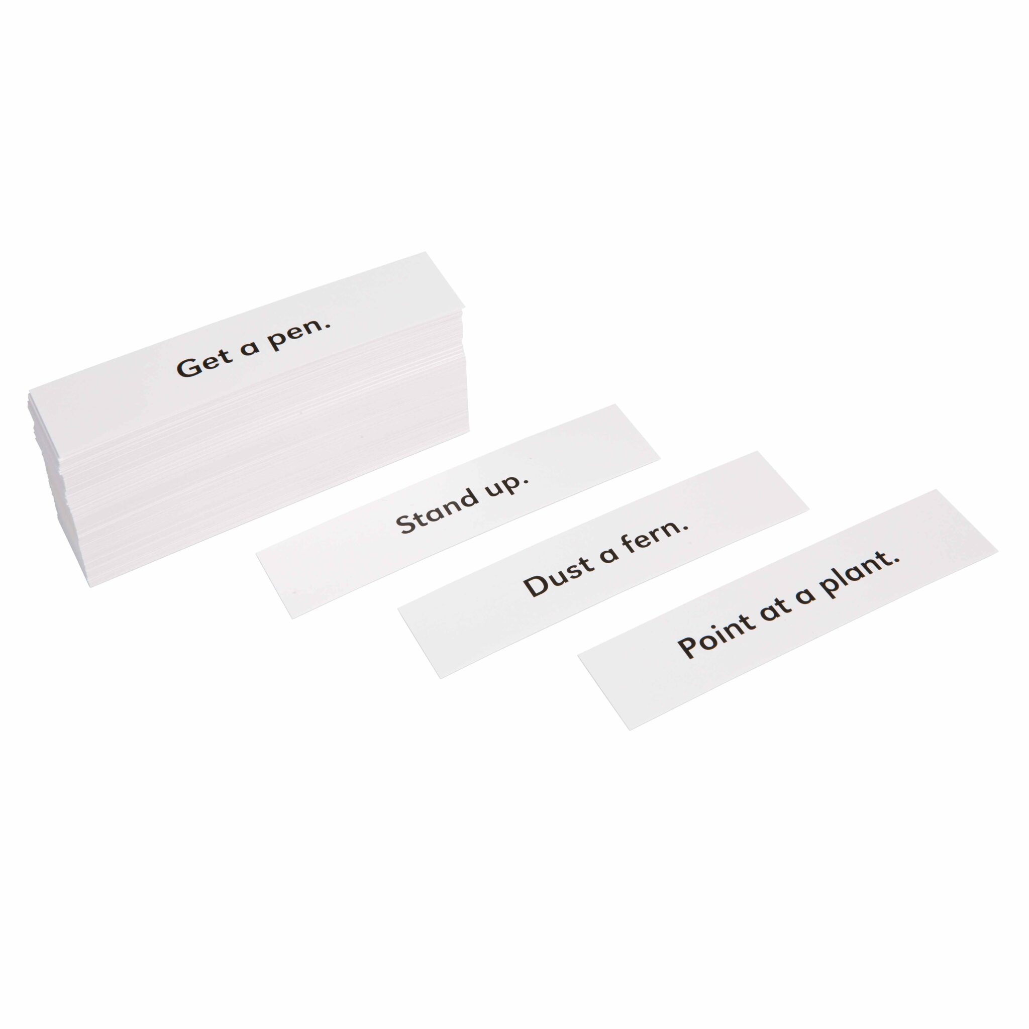 The Nienhuis Montessori simple commands set 2 exercises set includes 140 simple sentence cards printed on white card stock showing actions the child can perform.